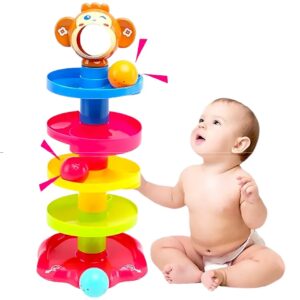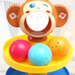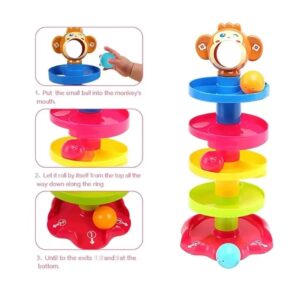 – Diviértete con este juguete: con rampas multicolores de 5 capas, 3 bolas y 1 cabeza de mono, simplemente coloca la bola rodante en la boca grande del apilador de monos en la parte superior y observa cómo la bola gira y cae desde el agujero de la torre de bolas hacia abajo. la rampa, que traería mucha diversión para tu bebé