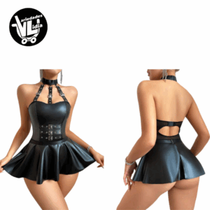 Características: piel sintética, cuello halter, cinturón con hebilla, hueco hacia fuera, juego de 2 piezas